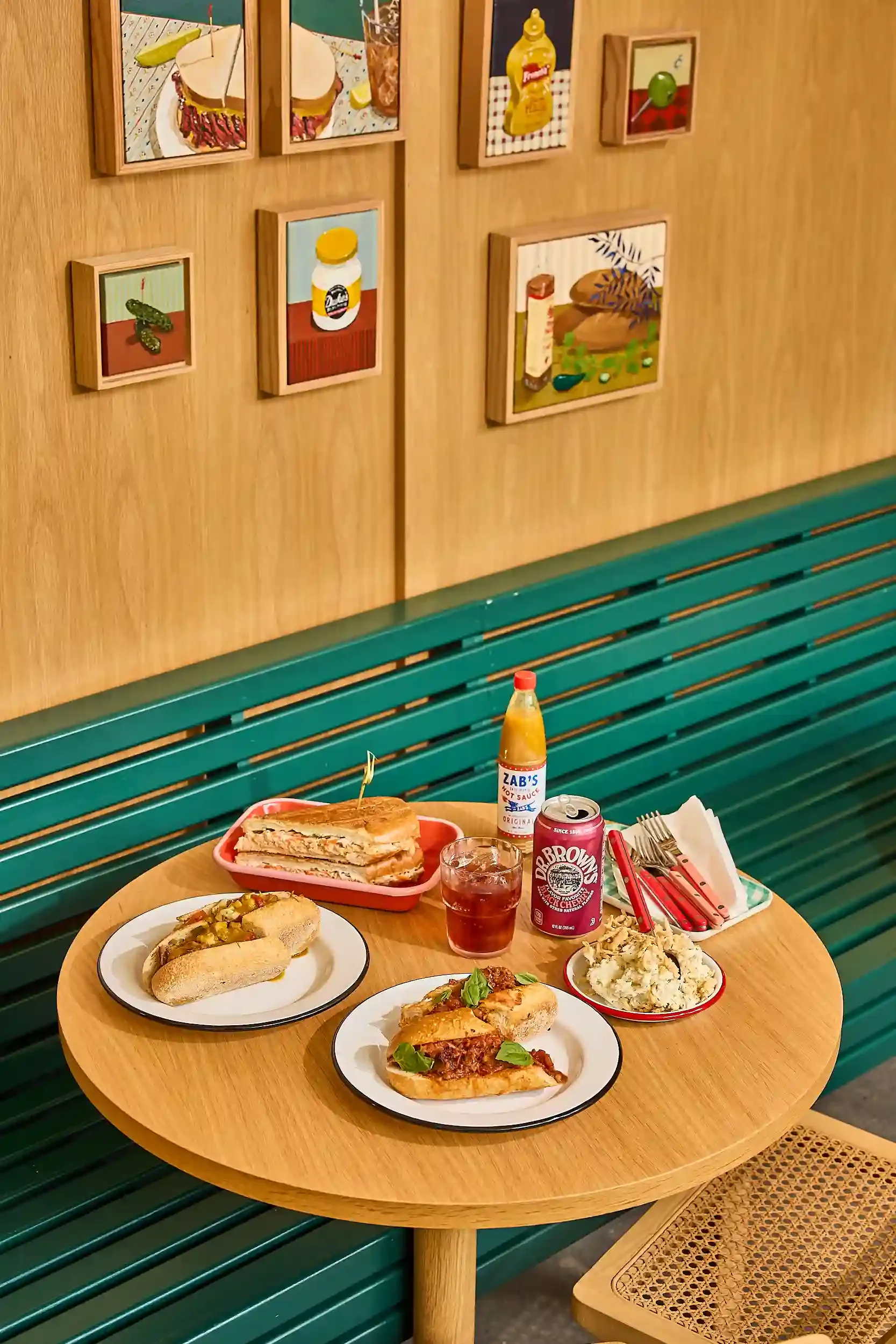 The menu highlights modern takes on deli staples, including the Meatball Parm (housemade charcuterie and beef meatballs, mozzarella, marinara on a French roll), Chopped Italian (Dutch crunch, Genoa salami, soppressata, mortadella, onion, lettuce, tomato, olives, vinegar), and Italian Beef (French roll, giardiniera, aged provolone, beef jus). Standouts like the Cubano with mojo pork and guava jam, or the Thai Tuna Melt with coconut cream cheese, cilantro, and carrots, add unexpected flavor and flair. For vegetarians, the Veggie Melt delivers with braised collards and coleslaw, and the Jive Turkey sandwich balances brightness and comfort with turkey breast, avocado, and apricot chutney.